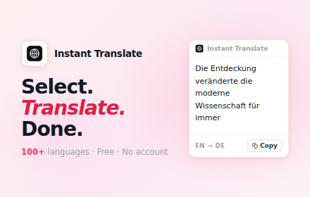 Select. Translate. Done. Get instant popup translations for any text on any webpage. 100+ languages supported.